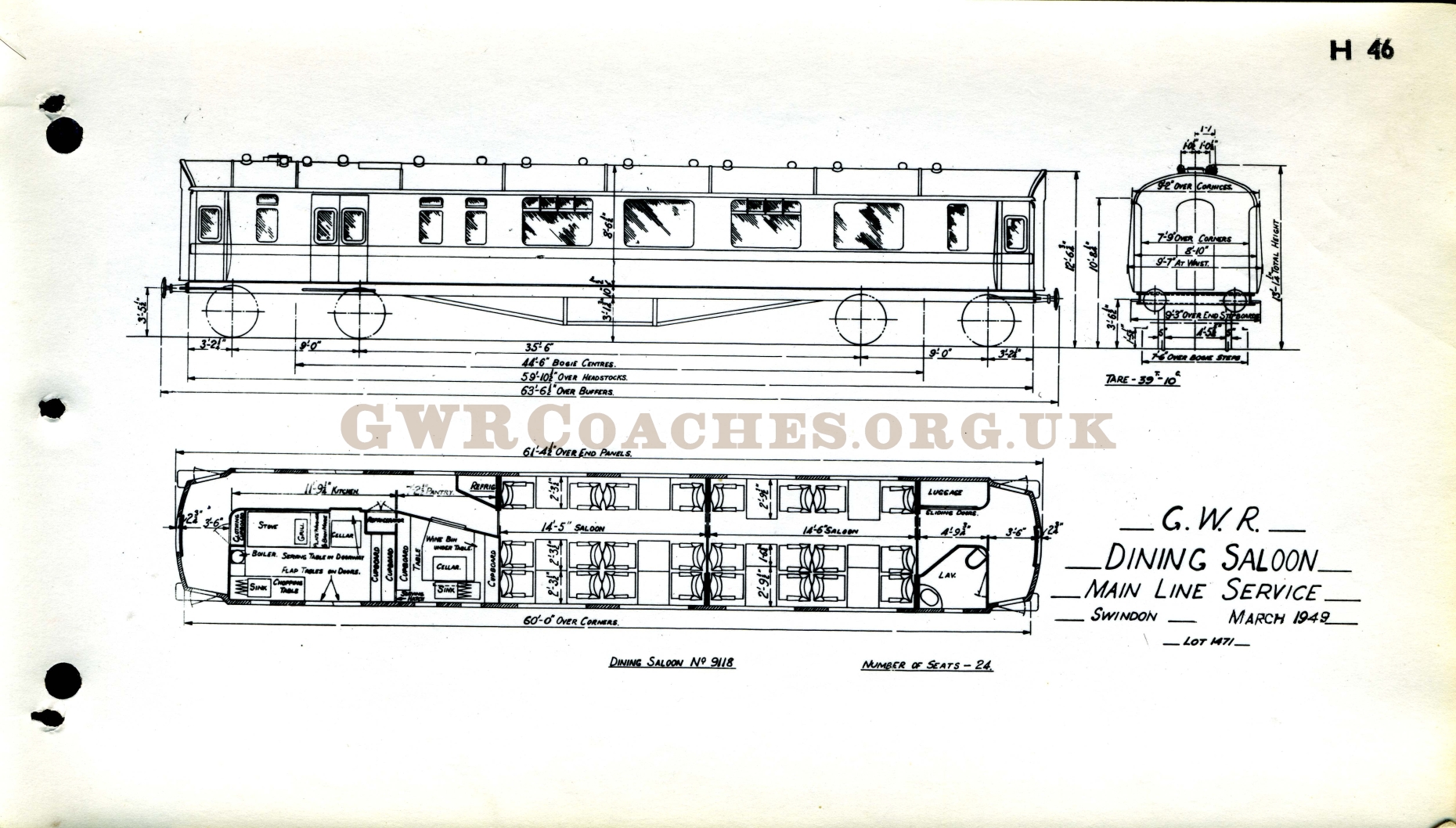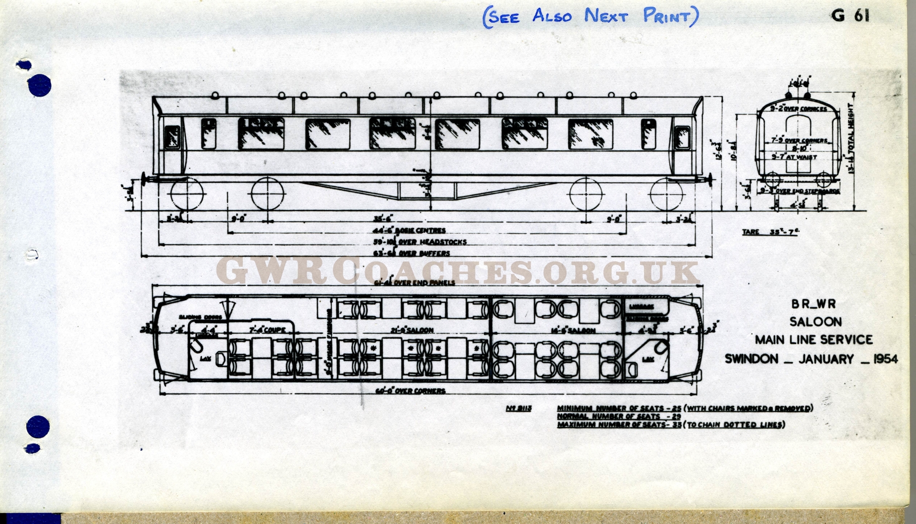 | For many years the number of passengers arriving at Plymouth from America on an Ocean Liner and wanting a fast train to London had increased. Initially the GWR had run specials as required. Then in 1929 they started a contract with Pullman to operate a set of Pullman coaches. This only lasted until late 1931 when the GWR introduced their own coaches which became known as the Super Saloons. Collett exploited extra large loading gauge of the line bewtween Plymouth Docks and Paddington and built his biggest 60' coaches ever. They were slightly bigger than the 1929 Cornish Riviera stock and looked so similar to the dining cars with their recessed ends doors. The eight coaches were built with a lavatory and luggage rack at each end, a coupe compartment for 4, a large saloon seating 17 and a smaller saloon seating upto 10. Each table looked out through a large picture window, half of them fitted with small sliding ventilators at the top. Oppulence way the keyword throughout mirroring the Pullman style and this was reflected by giving them the names of the Royal Family. For the first few years they ran with adjoining kitchen cars, but in 1935 two were converted to have their own kitchen. In 1947 the coaches were refurbished and larger ventilators were fitted to the windows. Even in BR days when the demand of cross atlantic travellers was lesser it wasn't unknown to run a train of 4 Super Saloons sandwiching a H54 Kitchen Car. |